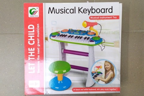 Plastové piano se stoličkou. Na pianu lze kromě klasických tónů také navolit různé podkresové melodie, měnit hudební nástroje a nahrávat svou hudbu. Součástí je také mikrofon. Piáno je na baterie (3 x AA - nejsou součástí). Součástí je také dětská stolička. Rozměry piana cca 46 x 24 x 57 cm. Rozměry balení cca 46 x 44 x 12 cm. Věk 3+