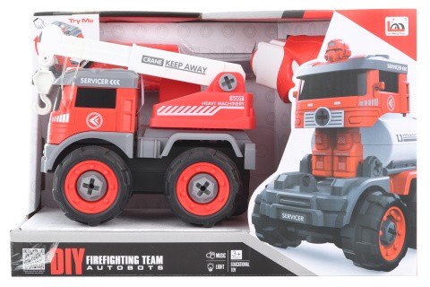 Šroubovací hasičské auto na dálkové ovládání. Auto lze sešroubovat pomocí přiloženého šroubováku nebo vrtačky. Z vrtačky lze vyndat motorek, který se vloží do auta a to poté jezdí pomocí ovládání dopředu a dozadu. Auto lze také transformovat na robota. Auto také vydává zvuky a svítí. Napájení na 4 AAA baterie (nejsou součástí) a na 3 LR41 baterie (jsou součástí). Rozměry hasičského auta cca 16 x 13 x 10 cm. Rozměry balení cca 26,5 x 14 x 17,5 cm. Věk 3+