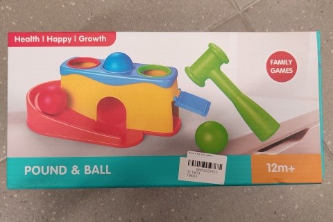 Plastová zatloukačka s dráhou o rozměru cca 27 x 13 x 10,5 cm se třemi míčky a kladívkem. Rozměr balení cca 27,5 x 14 x 11 cm. Věk 1+