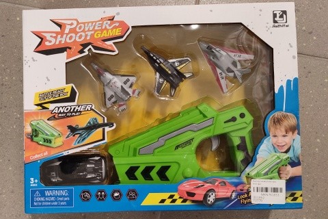 Plastové kombinované vystřelovací zařízeníe třemi letadly a autem. Zařízení může vystřelit autíčko po zemi, nebo vystřelit do vzduchu letadlo. Rozměr balení cca 29 x 22 x 6,5 cm. Věk 3+