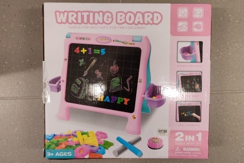 Magnetická tabule s doplňky. Z jedné strany je černá magnetická tabule a z druhé strany je bílá tabule na kterou lze kreslit fixou. Součástí balení jsou 2 speciální fixy, houbička a magnetická písmenka. Rozměry balení 41 x 38,5 x 7,5 cm.Věk 3+