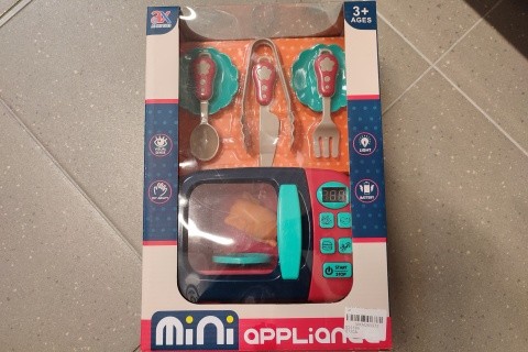 Plastová mikrovlnná trouba na baterie. Po zapnutí se točí a svítí. Součástí je také plastové kuře, 2 talířky a příbor. Napájení 3 x AA baterie - nejsou součástí. Rozměry balení cca 21,5 x 30,5 x 11 cm. Věk 3+