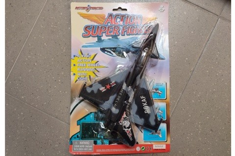 Plastová stíhačka na baterie o rozměru cca 28 x 21 cm. Po zavěšení na přibalené lanou se stíhačka točí do kola. Stíhačka po zapnití svítí roztáčí vrtulku jako pohon k lítání. Napájení 2 AA baterie - nejsou součástí. Rozměr balení cca 24 x 36,5 x 7,5 cm. Věk 5+
