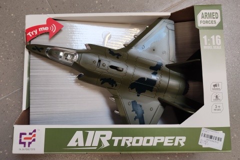 Plastová stíhačka o rozměru cca 32 x 22 cm na baterie. Stíhačka svítí a vydává zvuky. Napájení 3x AG13/LR44 - jsou součástí. Rozměr balení cca 32 x 22,5 x 8,5 cm. Věk 3+