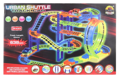 Plastová dráha s autíčkem, které po vložení baterií svítí a jezdí. Napájení na 2 AA baterii (není součástí). Sada obsahuje celkem 97 dílů. Rozměry balení cca 50 x 32 x 7,5 cm. Věk 3+