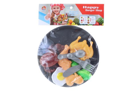 Sada jídlo obsahuje plastový tác o velikosti 22 cm,lžičku,vidličku,nůž ,valíčko, kuře ,karbanátek maso,stehýnko,křidélko,brokolici - vše z plastu.Rozměr balení cca 24 x 30 cm.Věk 3+