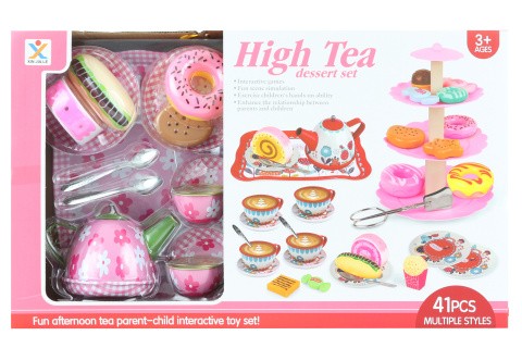 Plechový čajový set s dezertním talířem. Balení obsahuje konvičku, tác, 2 hrnečky, 2 podšálky, 2 talířky, 2 lžičky, plastový 3 patrový dezertní talíř a dortíky. Balení obsahuje celkem 41 kusů. Rozměry balení cca 43 x 25,5 x 9,5 cm. Věk 3+